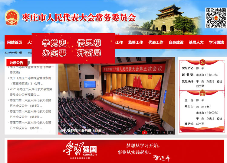 棗莊市人民代表大會是棗莊市的國家權力機關。 棗莊市人民代表大會每屆任期五年,每年至少舉行一次會議。會議由市人大常委會召集。經過五分之一以上代表建議,可以臨時召集市人民代表大會會議。1960年,棗莊市人民代表大會建立,并召開了棗莊市第一屆人民代表大會第一次會議。 棗莊市人民代表大會行使下列職權:在本行政區域內,保證憲法、法律、行政法規和上級人民代表大會及其常委會決議的遵守和執行,保證國家計劃和國家預算的執行;審查和批準本市的國民經濟和社會發展計劃、預算以及它們執行情況的報告;討論、決定本市的政治、經濟、教育、科學、文化、衛生、環境和資源保護、民政、民族等工作的重大事項;選舉市人大常委會的組成人員;選舉市長、副市長;選舉市監察委員會主任、市中級人民法院院長和人民檢察院檢察長。選出的市人民檢察院檢察長,須報經省人民檢察院檢察長提請省人大常委會批準;選舉省人民代表大會代表;聽取和審查市人大常委會的工作報告;聽取和審查市人民政府、中級人民法院和人民檢察院的工作報告;改變或者撤銷市人大常委會的不適當的決議;撤銷市人民政府的不適當的決定和命令;保護社會主義的全民所有的財產和勞動群眾集體所有的財產,保護公民私人所有的合法財產,維護社會秩序,保障公民的人身權利、民主權利和其他權利;保護各種經濟組織的合法權益;保障少數民族的權利;保障憲法和法律賦予婦女的男女平等、同工同酬和婚姻自由等各項權利。 棗莊市第十六屆人民代表大會代表共有394名。市十六屆人大一次會議于2017年2月19日至23日舉行,決定設立市第十六屆人民代表大會法制委員會、內務司法委員會、財政經濟委員會、教育科學文化衛生委員會、城鄉建設環境保護委員會、農業與農村委員會、民族僑務外事委員會。 棗莊市十六屆人大三次會議于2019年1月6日至9日舉行,決定增設棗莊市第十六屆人民代表大會社會建設委員會和更名棗莊市第十六屆人民代表大會內務司法委員會為棗莊市第十六屆人民代表大會監察和司法委員會。 |