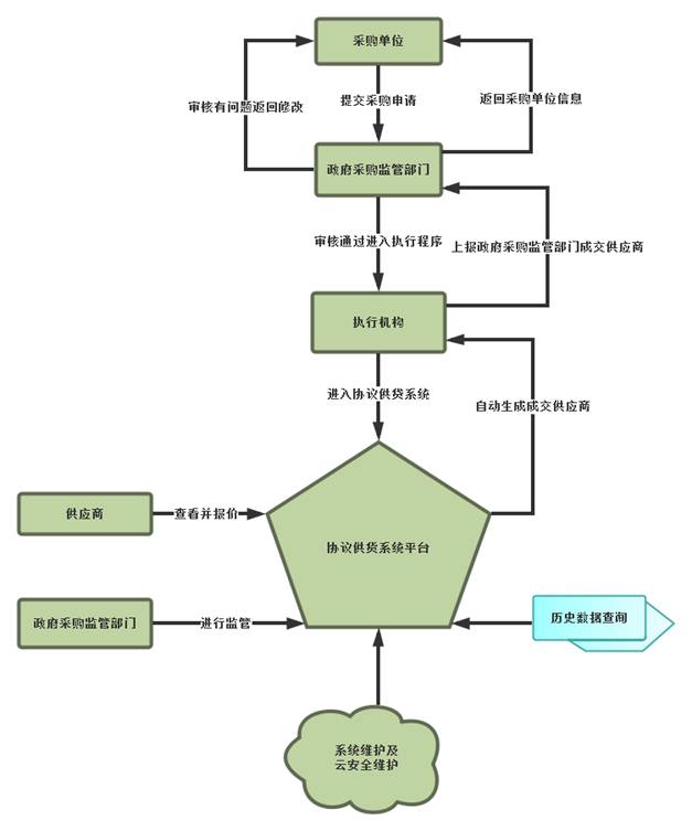 二、采購系統進行流程 本系統在發生采購需求時,各級采購單位應將業務需求、技術規格、售后服務、采購數量、采購預算金額等內容上報給政府政府采購管理辦公室,由政府政府采購管理辦公室交由執行機構統一錄入進本系統,由本系統進行自動項目編號,
