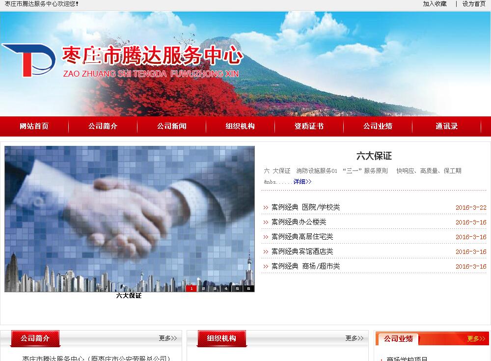 棗莊市騰達服務中心(原棗莊市公安勞服總公司)成立于1979年,屬國有企業,1992年被山東消防總隊批準具有國家消防設施工程專業的承包二級資質的市級重點單位、山東省消防協會會員單位、棗莊市消防協會、棗莊市建筑業協會理事單位,專業從事自動消防系統工程的設計、施工、安裝和維護保養。主要承接各類建筑工程的室內外消防水系統,火災、報警系統、防煙、排煙系統、消防控制系統、安全疏散指示系統消防系統工程。我公司為了使個用戶單位擺脫繁瑣的工作程序,為用戶單位提供從設計、審批、施工、安裝、調試、檢測、驗收到培訓、定期質量檢查、年檢及維修保養的各種售后服務的一條龍配套服務,盡大能力為個用戶單位排憂解難。多年來,多次被棗莊市委市政府評為“重合同,守信用”信得過單位。 |